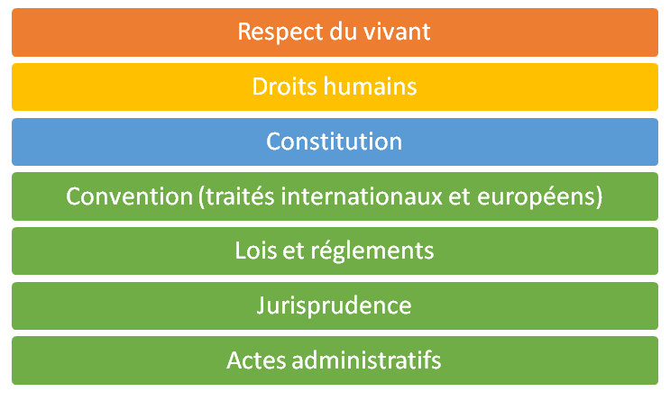 Plus on s?élève dans la pyramide, plus les textes de loi ont une valeur juridique importante. Aucun arrêté ministériel n?abroge de loi: il ne peut pas passer au-dessus d?une loi.