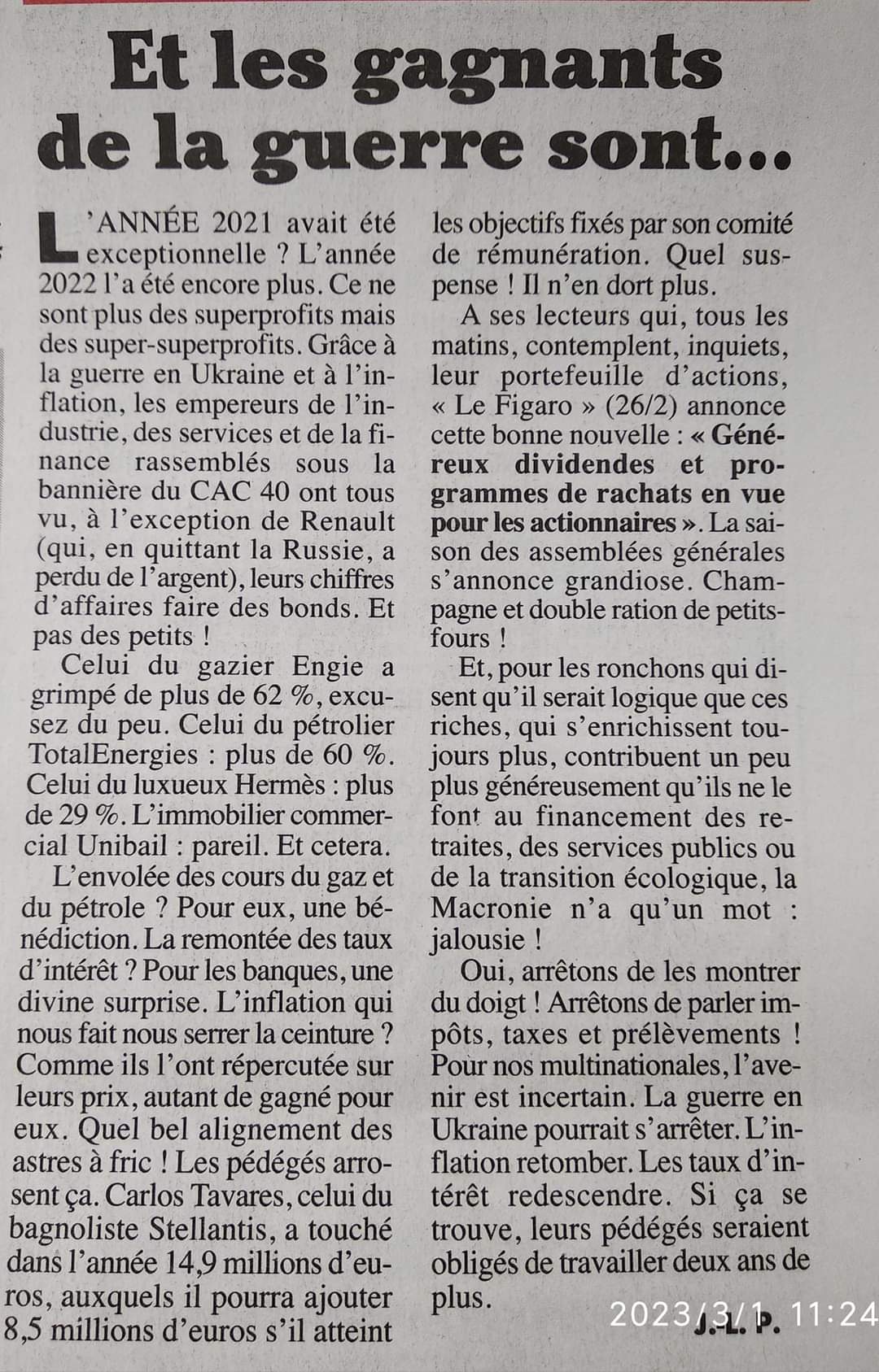 Ce sont ces profits, qui ne bénéficient pas au bien commun mais uniquement à une petite clique de financiers déjà ultra-riches, qui ont provoqué une accélération de l'inflation. Et le patronat profite de l'inflation pour gonfler ses prix, ce qui gonfle l'inflation.